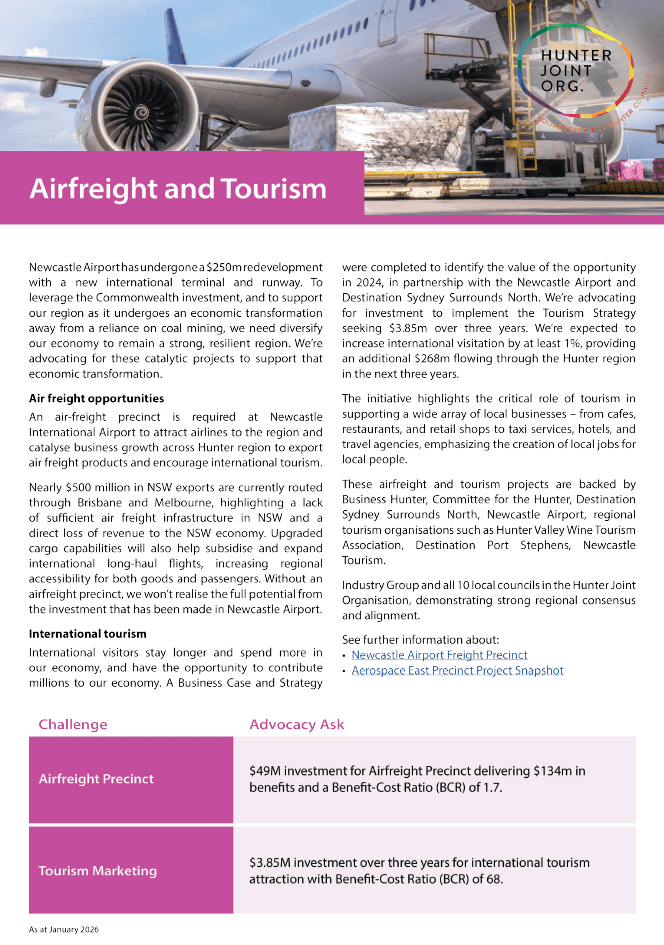 These airfreight and tourism projects are backed by Business Hunter, Committee for the Hunter, Destination Sydney Surrounds North, Newcastle Airport, regional tourism organisations such as Hunter Valley Wine Tourism Association, Destination Port Stephens, Newcastle Tourism