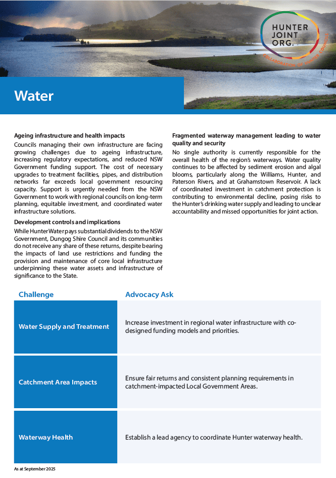 Councils managing their own infrastructure are facing growing challenges due to ageing infrastructure, increasing regulatory expectations, and reduced NSW Government funding support. The cost of necessary upgrades to treatment facilities, pipes, and distribution networks far exceeds local government resourcing capacity. Support is urgently needed from the NSW Government to work with regional councils on long-term planning, equitable investment, and coordinated water infrastructure solutions.