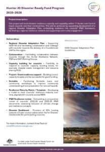 This project will build disaster resilience capacity and capability within 11 Hunter and Central Coast councils and their communities. This will be achieved by supporting development of a regional Disaster Adaptation Plan, embedding resilience into councils’ IP&R framework, facilitating a regional resilience network and supporting community engagement.